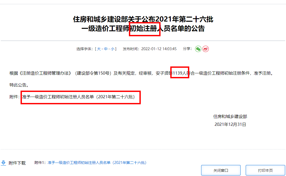 住房和城鄉(xiāng)建設(shè)部關(guān)于公布2021年第二十六批一級造價(jià)工程師初始注冊人員名單的公告