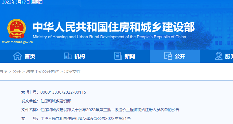 住建部公布2022年第三批一級造價工程師初始注冊人員名單的公告