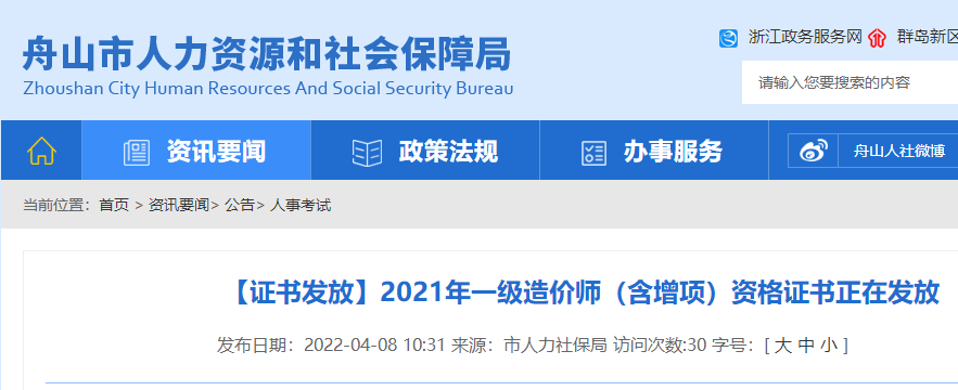 舟山2021年一級造價師(含增項)資格證書正在發(fā)放
