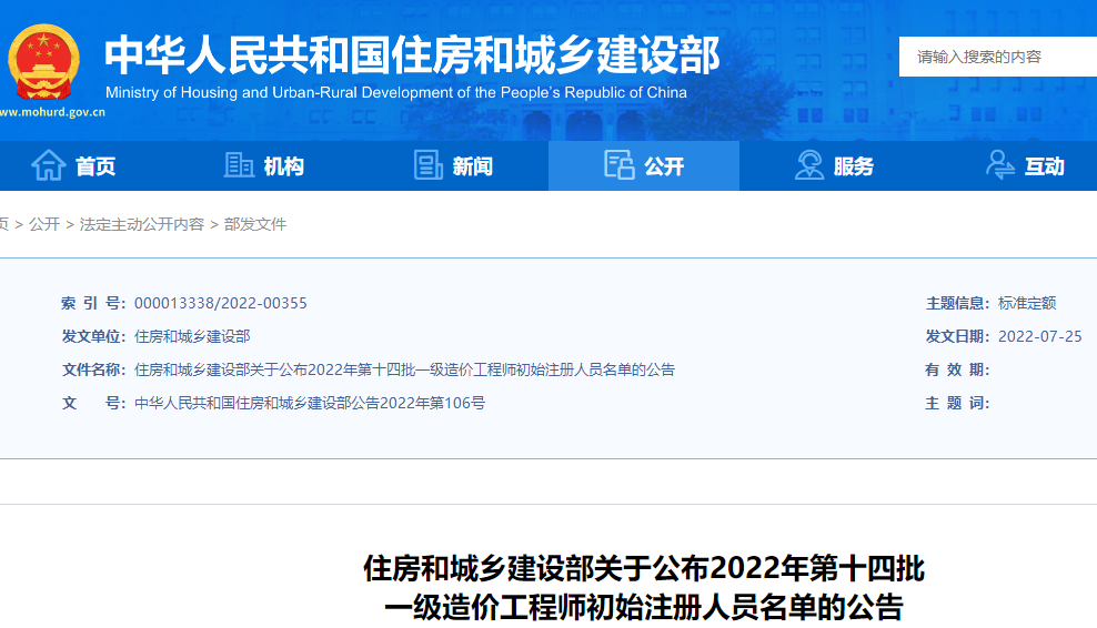 住建廳公布2022年第十四批 一級(jí)造價(jià)工程師初始注冊(cè)人員名單的公告