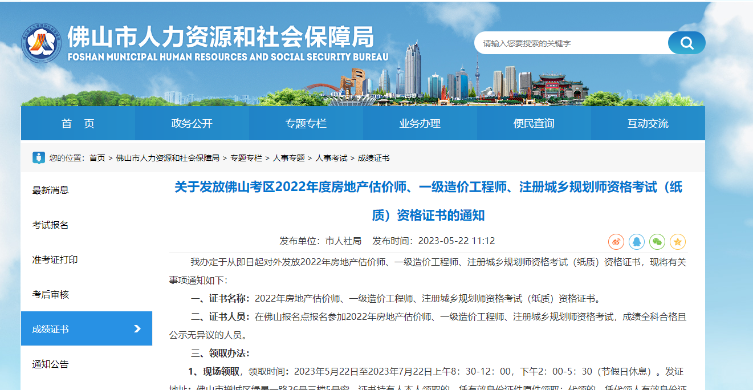 廣東佛山關(guān)于發(fā)放2022年度一級(jí)造價(jià)工程師專業(yè)技術(shù)資格證書的通知