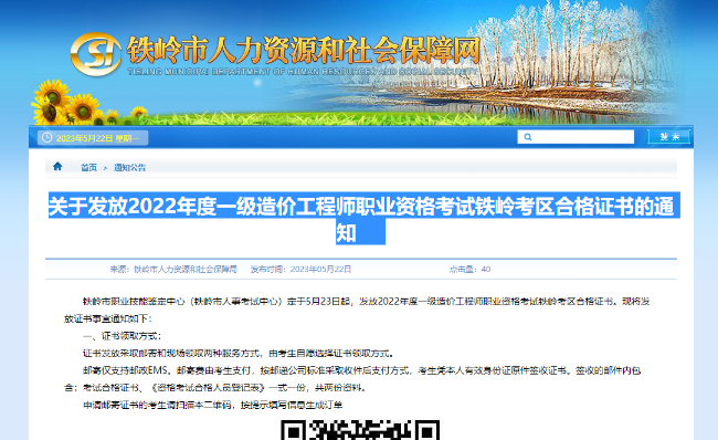 關(guān)于發(fā)放2022年度一級造價工程師職業(yè)資格考試鐵嶺考區(qū)合格證書的通知