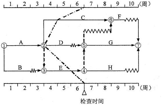 某工程雙代號時標(biāo)網(wǎng)絡(luò)計劃如下圖所示,根據(jù)第6周末實際進度檢查結(jié)果繪制的前鋒線如點劃線所示。通過比較可以看出(   )。