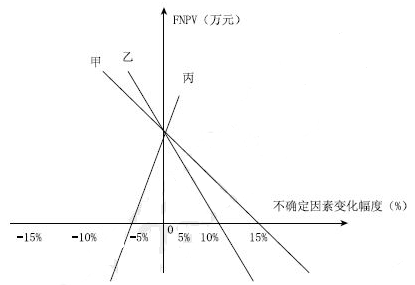 現(xiàn)對技術方案進行單因素敏感性分析,選擇凈現(xiàn)值作為分析對象,如下圖所示,甲、乙、丙三個不確定因素與X軸的交點分別為15%、10%、-5%,則下列說法中正確的是( )。