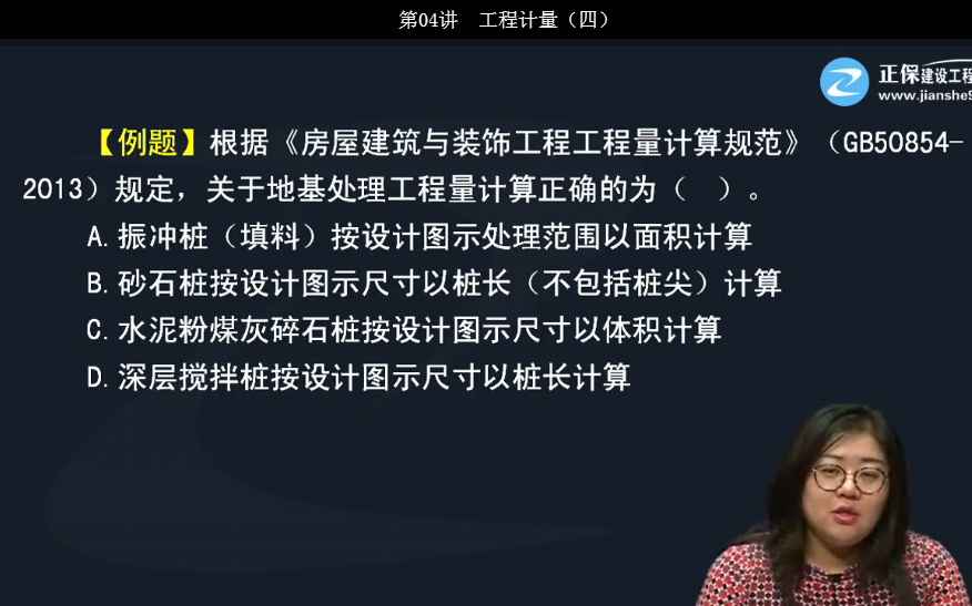 【答案解析】本題考查的是地基處理與邊坡。換填墊層按設(shè)計(jì)圖示尺寸以體積計(jì)算。強(qiáng)夯地基按設(shè)計(jì)圖示處理范圍以面積計(jì)算。振沖樁(填料)以米計(jì)量,按設(shè)計(jì)圖示尺寸以樁長(zhǎng)計(jì)算或以立方米計(jì)量,按設(shè)計(jì)樁截面乘以樁長(zhǎng)以體積計(jì)算。水泥粉煤灰碎石樁按設(shè)計(jì)圖示尺寸以樁長(zhǎng)(包括樁尖)計(jì)算。