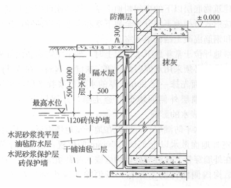 地下室的所有墻體必須設(shè)兩道水平防潮層,一道設(shè)在地下室地坪附近,另一道設(shè)在室外地面散水150~200mm的位置。