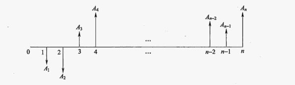 (1)橫軸為時(shí)間軸,0表示時(shí)間序列的起點(diǎn),n表示時(shí)間序列的終點(diǎn)。軸上每一間隔表示一個(gè)時(shí)間單位(計(jì)息周期),一般可取年、半年、季或月等,整個(gè)橫軸表示系統(tǒng)的壽命周期。