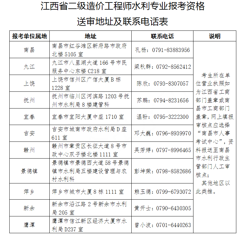 7.江西省二級造價工程師水利專業(yè)報考資格送審地址及聯(lián)系電話表.doc