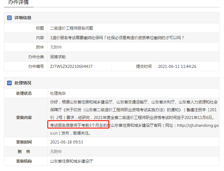 根據(jù)近日山東省住房城鄉(xiāng)建設(shè)廳辦件處理問(wèn)題中了解到,山東省2021年二級(jí)造價(jià)師考試公告預(yù)計(jì)將于8月初進(jìn)行發(fā)布,請(qǐng)山東考生及時(shí)留意。