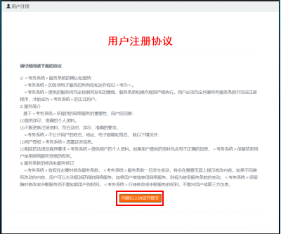 請(qǐng)用戶先注冊(cè)賬號(hào),點(diǎn)擊“報(bào)名注冊(cè)”按鈕,注冊(cè)前請(qǐng)先仔細(xì)閱讀用戶注冊(cè)協(xié)議,無異議則點(diǎn)擊“同意以上協(xié)議并提交”按鈕,如圖6所示。