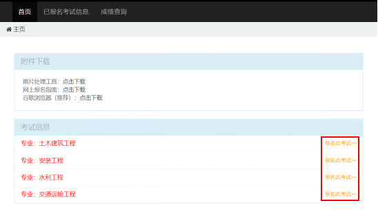 考生在報(bào)名首頁的“考試信息”列表中,選擇需要報(bào)名的考試,并點(diǎn)擊相對(duì)應(yīng)的“報(bào)名此考試”按鈕,如圖9所示: