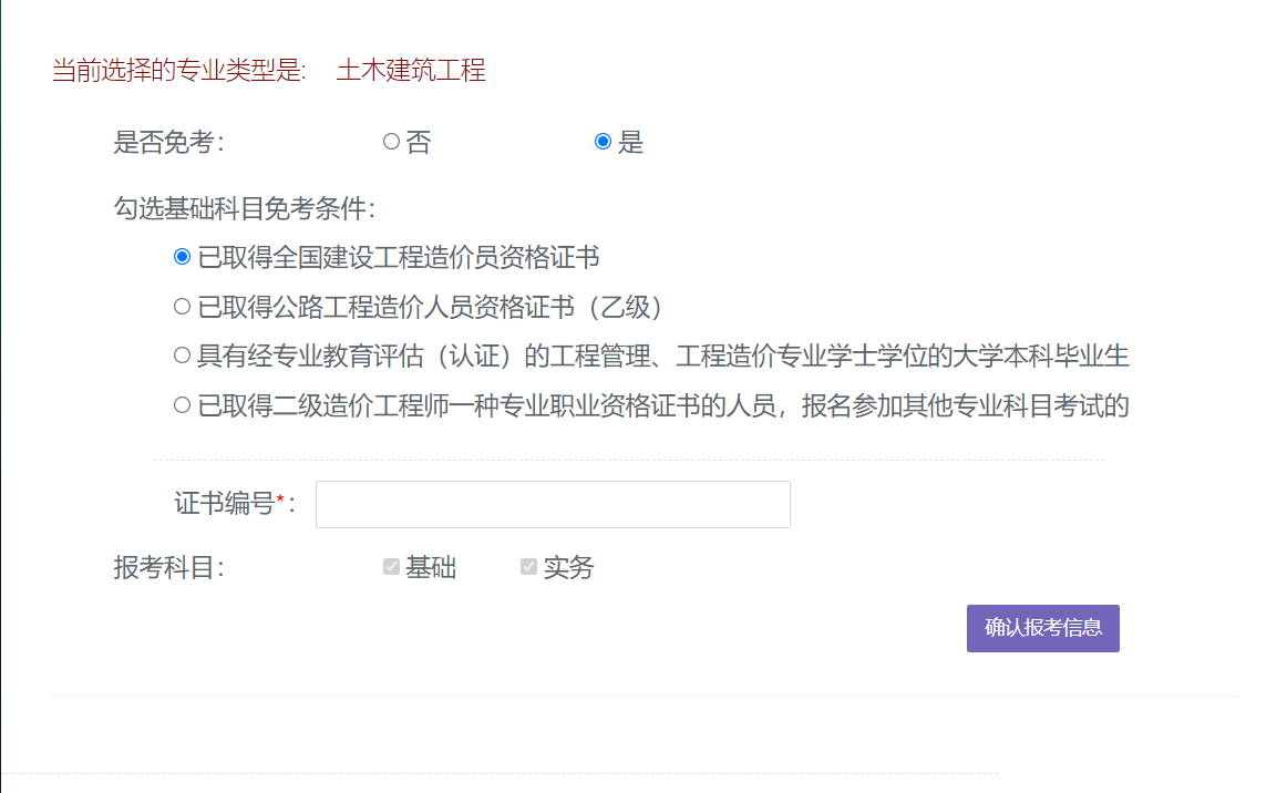 進(jìn)入考試報(bào)名界面前,請(qǐng)考生先選擇是否有免考資格,確認(rèn)無誤后點(diǎn)擊“確認(rèn)報(bào)考信息”按鈕。