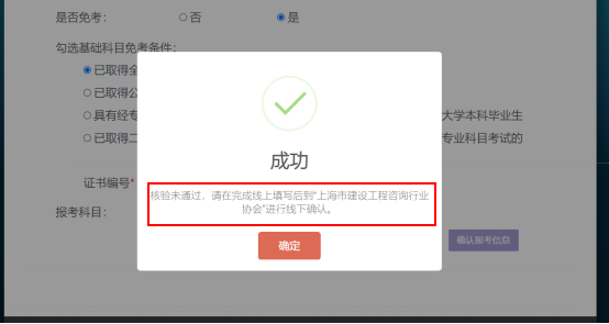 當(dāng)考生勾選有已取得的基礎(chǔ)科目免考條件,系統(tǒng)會(huì)對(duì)考生選擇的免考條件進(jìn)行在線核驗(yàn),若在線核驗(yàn)不通過,請(qǐng)考生在系統(tǒng)中輸入證書編號(hào),并在打印報(bào)名確認(rèn)單后,攜帶相關(guān)材料前往核驗(yàn)點(diǎn)進(jìn)行線下確認(rèn),如圖11所示: