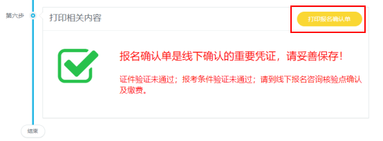 若考生信息核驗(yàn)不通過,可以在打印報(bào)名確認(rèn)單并選擇報(bào)名咨詢核驗(yàn)點(diǎn)(以下簡(jiǎn)稱“核驗(yàn)點(diǎn)”)后,攜帶相關(guān)材料前往核驗(yàn)點(diǎn)進(jìn)行線下確認(rèn)。