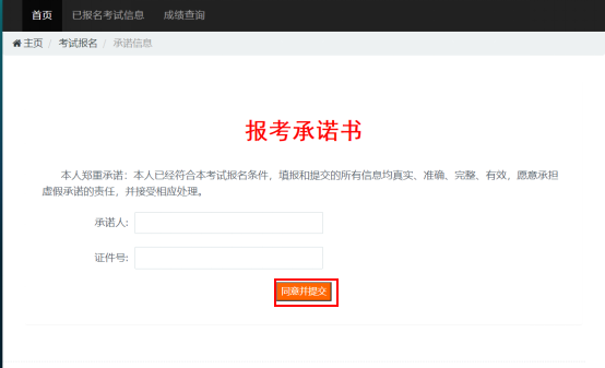請(qǐng)考生仔細(xì)閱讀“報(bào)考承諾書”,同意請(qǐng)?jiān)诔兄Z書中填寫承諾人姓名及證件號(hào)碼,并點(diǎn)擊“同意并提交”按鈕,系統(tǒng)會(huì)對(duì)錄入的承諾人信息進(jìn)行核驗(yàn),須承諾人信息與注冊(cè)信息一致。若信息不一致則需考生重新填寫。