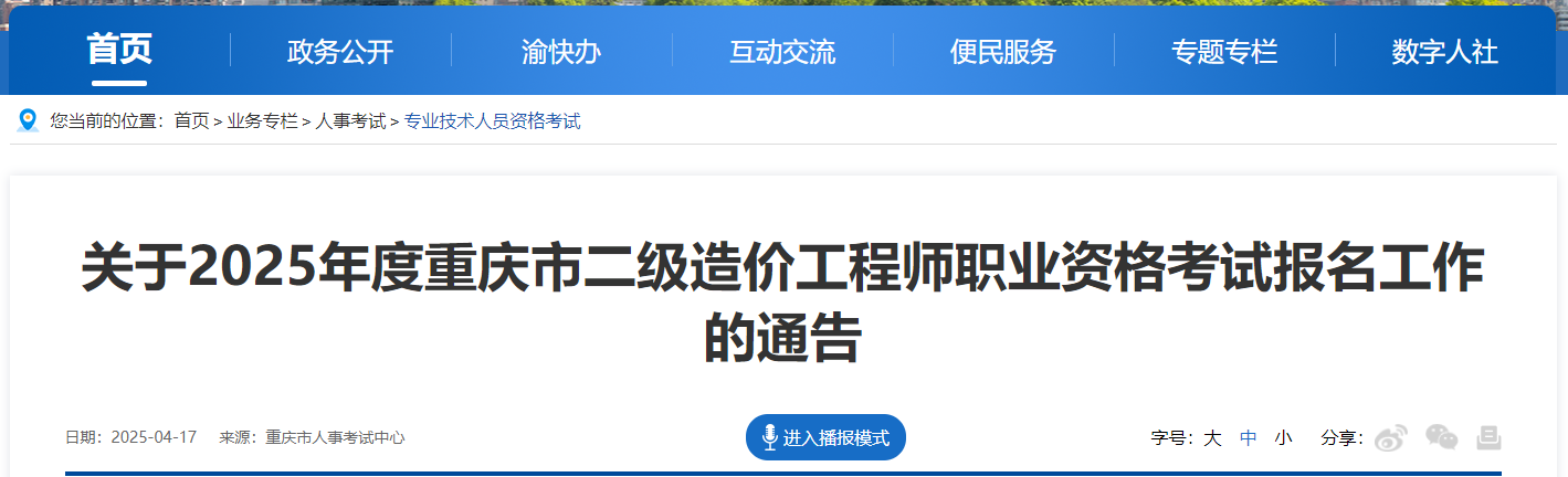 關(guān)于2025年度重慶市二級造價(jià)工程師職業(yè)資格考試報(bào)名工作的通告