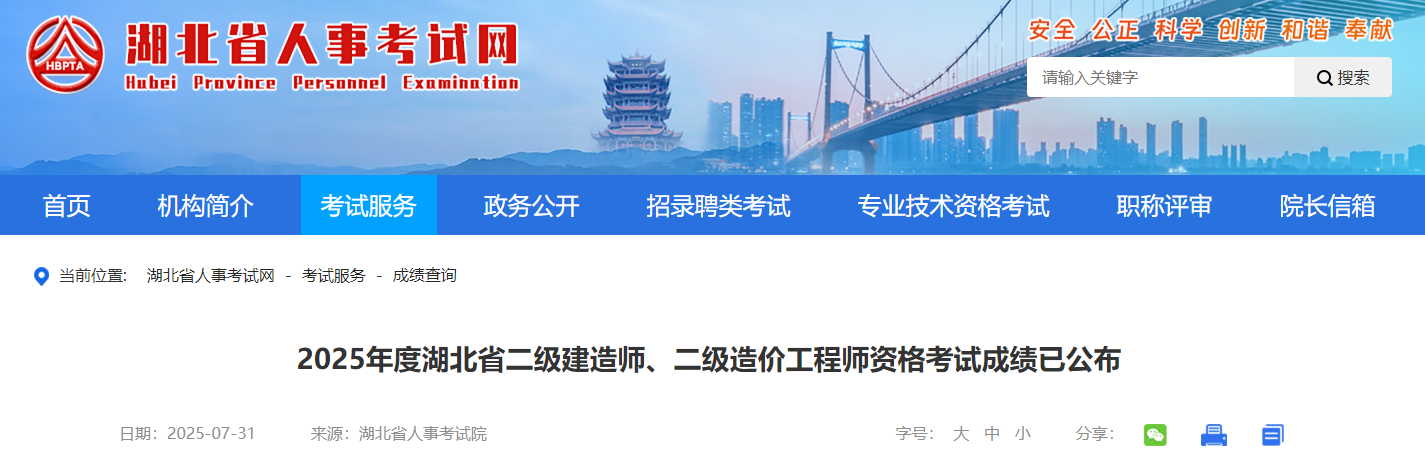 2025年度湖北省二級(jí)造價(jià)工程師資格考試成績(jī)于2025年7月31日公布,請(qǐng)考生到湖北人事考試網(wǎng)“成績(jī)查詢”欄目進(jìn)行查詢。官方通知如下: