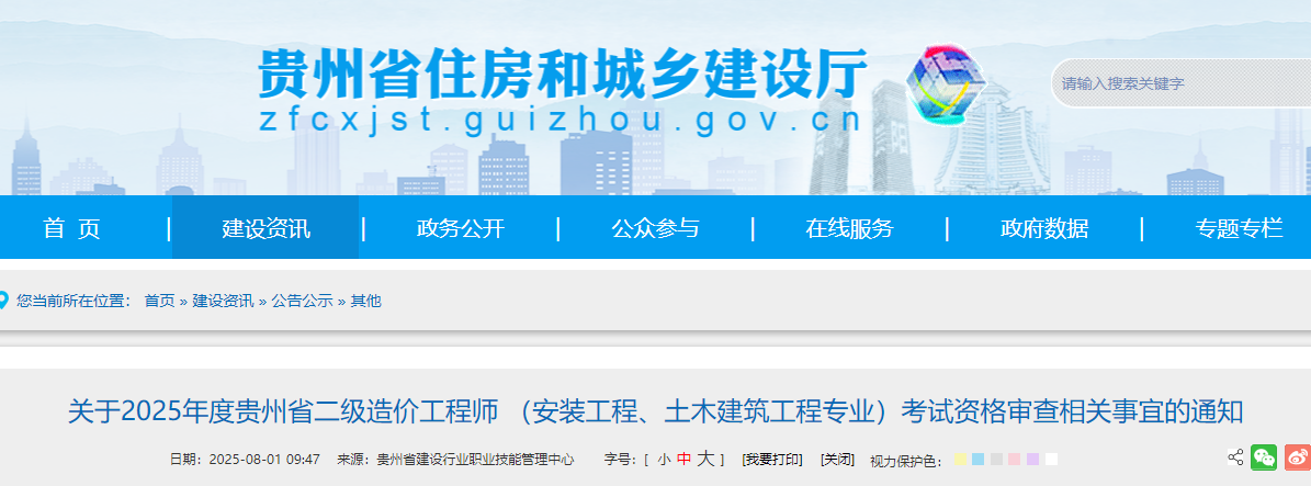 貴州省2025年二級(jí)造價(jià)工程師(安裝工程、土木建筑工程專業(yè))考試資格審查通知