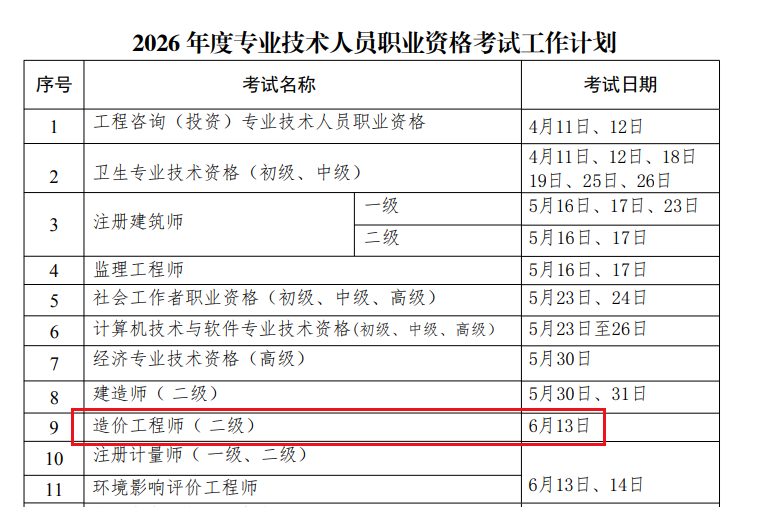 寧夏人事考試中心網(wǎng)站發(fā)布2026年二級造價師考試計劃,考試時間為:6月13日,具體信息如下: