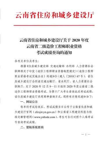 云南省住房和城鄉(xiāng)建設(shè)廳關(guān)于2020年度云南省二級造價工程師職業(yè)資格考試成績查詢的通知