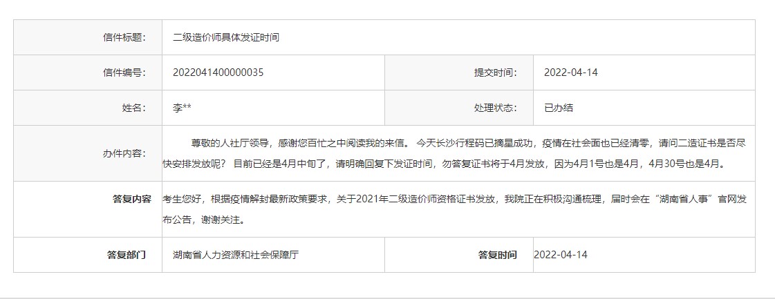 考生提問(wèn): 尊敬的人社廳領(lǐng)導(dǎo),感謝您百忙之中閱讀我的來(lái)信。 今天長(zhǎng)沙行程碼已摘星成功,疫情在社會(huì)面也已經(jīng)清零,請(qǐng)問(wèn)二造證書是否盡快安排發(fā)放呢? 目前已經(jīng)是4月中旬了,請(qǐng)明確回復(fù)下發(fā)證時(shí)間,勿答復(fù)證書將于4月發(fā)放,因?yàn)?月1號(hào)也是4月,4月30號(hào)也是4月。