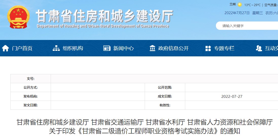 關(guān)于印發(fā)《甘肅省二級造價工程師職業(yè)資格考試實施辦法》的通知