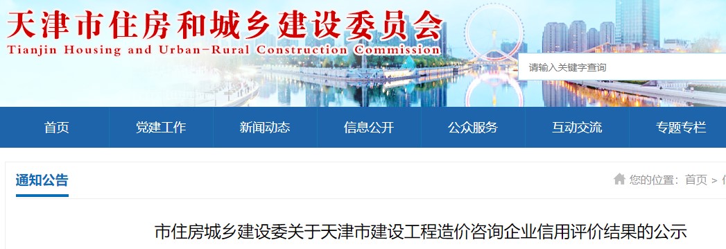 市住房城鄉(xiāng)建設委關于天津市建設工程造價咨詢企業(yè)信用評價結果的公示