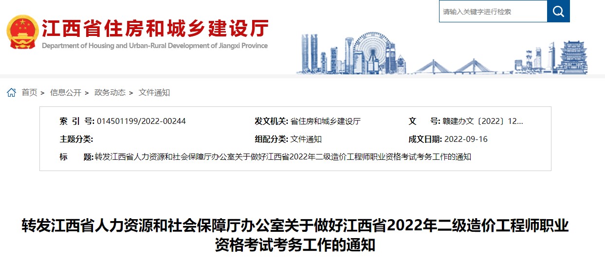 江西住建廳轉(zhuǎn)發(fā)關(guān)于做好2022年二級造價工程師資格考試考務(wù)工作的通知