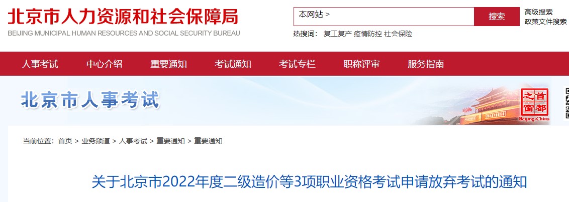 關于北京市2022年度二級造價等3項職業(yè)資格考試申請放棄考試的通知