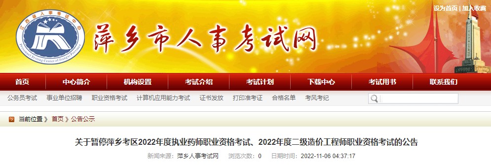 關(guān)于暫停萍鄉(xiāng)考區(qū)2022年度執(zhí)業(yè)藥師職業(yè)資格考試、2022年度二級(jí)造價(jià)工程師職業(yè)資格考試的公告