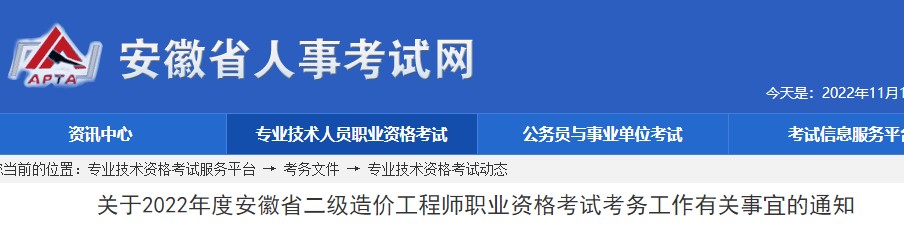安徽關(guān)于2022年度二級(jí)造價(jià)工程師職業(yè)資格考試考務(wù)工作有關(guān)事宜的通知