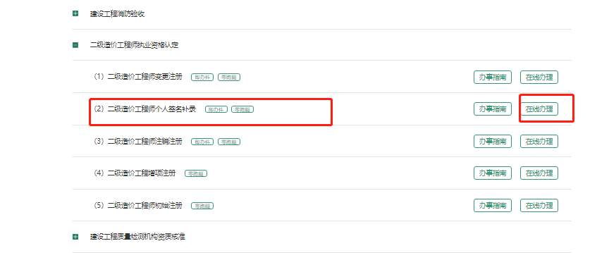 (4)選擇“個人簽名補(bǔ)錄”,點(diǎn)擊“在線辦理”