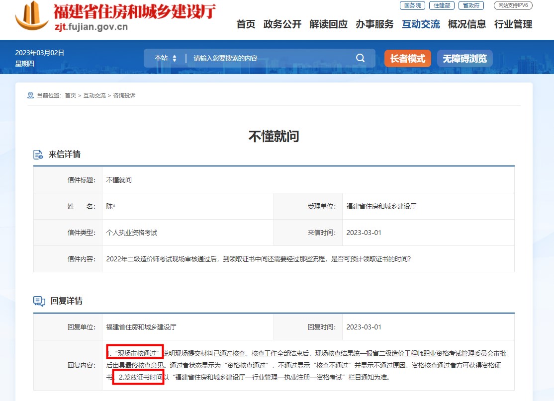 近日,有考生就證書領取的問題咨詢了福建省住建廳,得到官方回復。