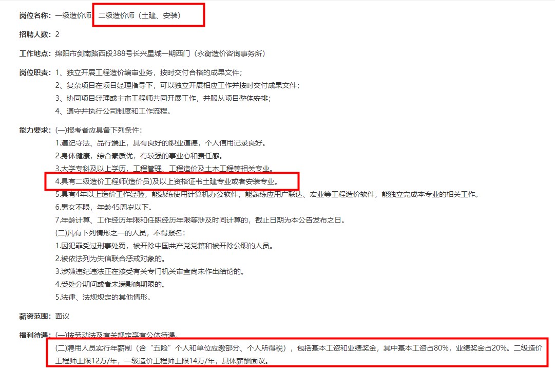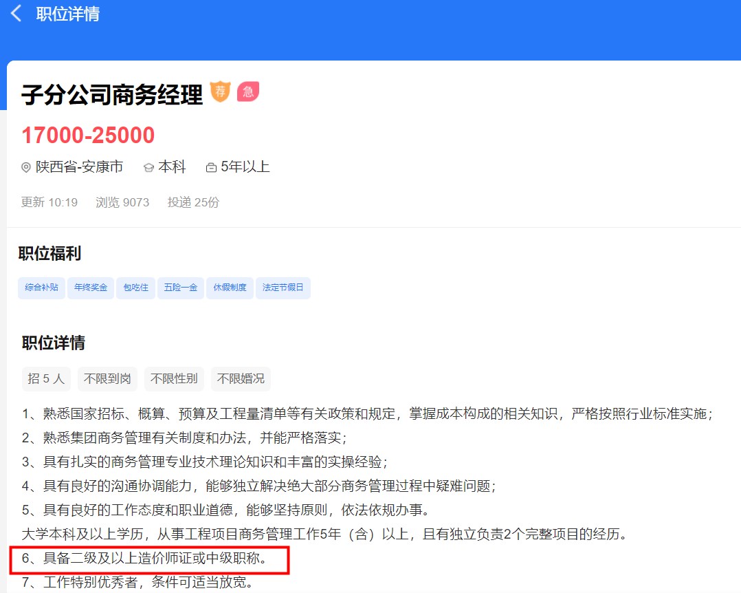 二造證書還是邁入行業(yè)的門檻,各大公司招聘要求都標明擁有二級造價師證書優(yōu)先!