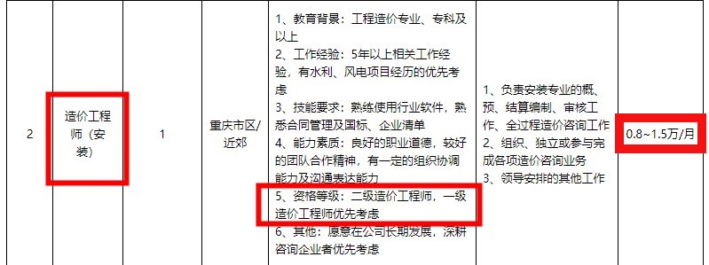 重慶某工程管理有限公司在招聘信息中表明,具有二級(jí)造價(jià)師證書(shū)優(yōu)先,薪酬0.8-1.5w/月。