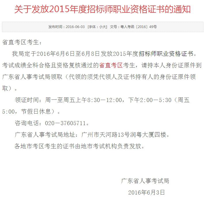 摘要:廣州地區(qū)2015年招標(biāo)師考試證書可以領(lǐng)取了,領(lǐng)取時(shí)間為2016年6月6日至6月8日,周一至周五上午8:30-12:00,下午2:00-5:30(周五5:00,節(jié)假日休息)。領(lǐng)取地址為廣州市天河路13號(hào)潤(rùn)粵大廈四樓。