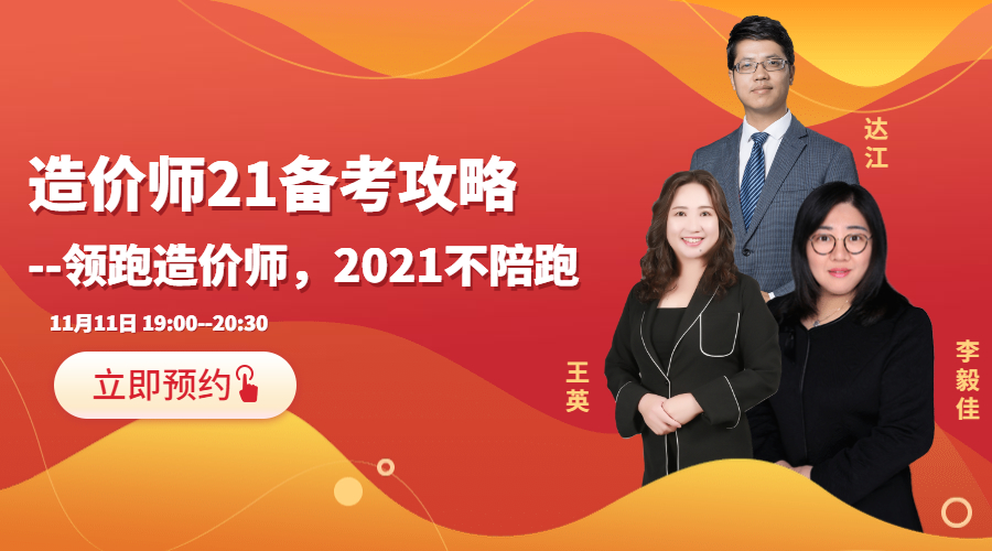 2020年一級造價師考試已經(jīng)結束,2021年一級造價師考試備考可以開始了!在新的一年怎么備考呢?2021年一級造價師考試不陪考,11月11日,在直播間王英、李毅佳、達江做客,等你!與你們不見不散!