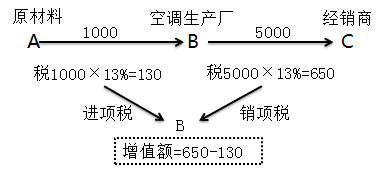 空調(diào)生產(chǎn)廠B銷售給經(jīng)銷商C時,銷售過程產(chǎn)生的增值稅650元,由C通過付款已經(jīng)給了B(收款)。在購買壓縮機時,空調(diào)生產(chǎn)廠B也是一個消費者,購買的原材料所產(chǎn)生的增值稅130元,在支付給壓縮機廠家價款時已經(jīng)支付給了壓縮機廠家A(支出),所以在給國家繳納稅款時就不應該再承擔這部分的稅費,只對增值部分計稅。即應納增值稅=銷項稅-進項稅=650-130=520元/臺。