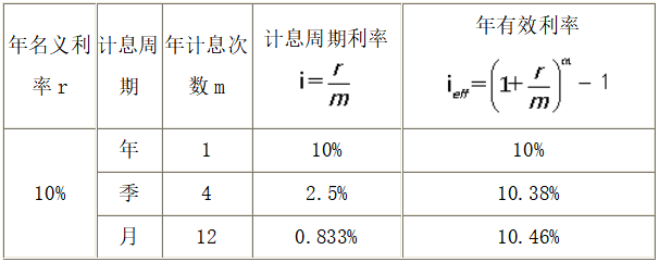 現(xiàn)設年名義利率為10%,則按年、季、月計息的年有效利率見下表。