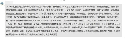 2019年度的咨詢工程師考試成績今天上午終于張榜,最終最后1科《項目決策分析與評價》得分89分,順利圓滿通過。起初考前模擬考試信心滿滿,但出卷老師制造了懸念,難度成幾何倍數(shù)增長,故近兩個月以來,心里面在打鼓,得知今天通過,可以圓滿拿到咨詢工程師的證書,長舒一口氣,3年(第1年由于只有2個多月的時間準(zhǔn)備,故只準(zhǔn)備了《宏觀經(jīng)濟政策與發(fā)展規(guī)劃》,結(jié)果出來前,報了正保建設(shè)工程教育網(wǎng)4科,結(jié)果出來后,該科成績?yōu)?6分,該科屬純自學(xué)性質(zhì)通過的吧。2018年度,報考余下的3科,這一年度的最終成績分別為《工程項目組織與管理》80分,《項目決策分析與評價》71分,《現(xiàn)代咨詢方法與實物》80分。不灰心,也不放棄,好事多磨,2019年度繼續(xù)努力并重新出發(fā),功夫不負(fù)有心人,圓了自己咨詢工程師這一個小小的夢想),在這里很感謝正保建設(shè)工程教育網(wǎng)的3位老師,分別為唐瓊老師,張潔函老師,林軒老師(另1位老師雖然買了教材,但未聽其課,故在這里不作過多的評價,但從眾人口碑中也能感覺出來,也是一位優(yōu)秀且很棒的人民教師),很感謝您們的辛勤努力及幫助,在這里真誠的道一聲:老師辛苦了!愿貴校越辦越好,桃李滿天下!