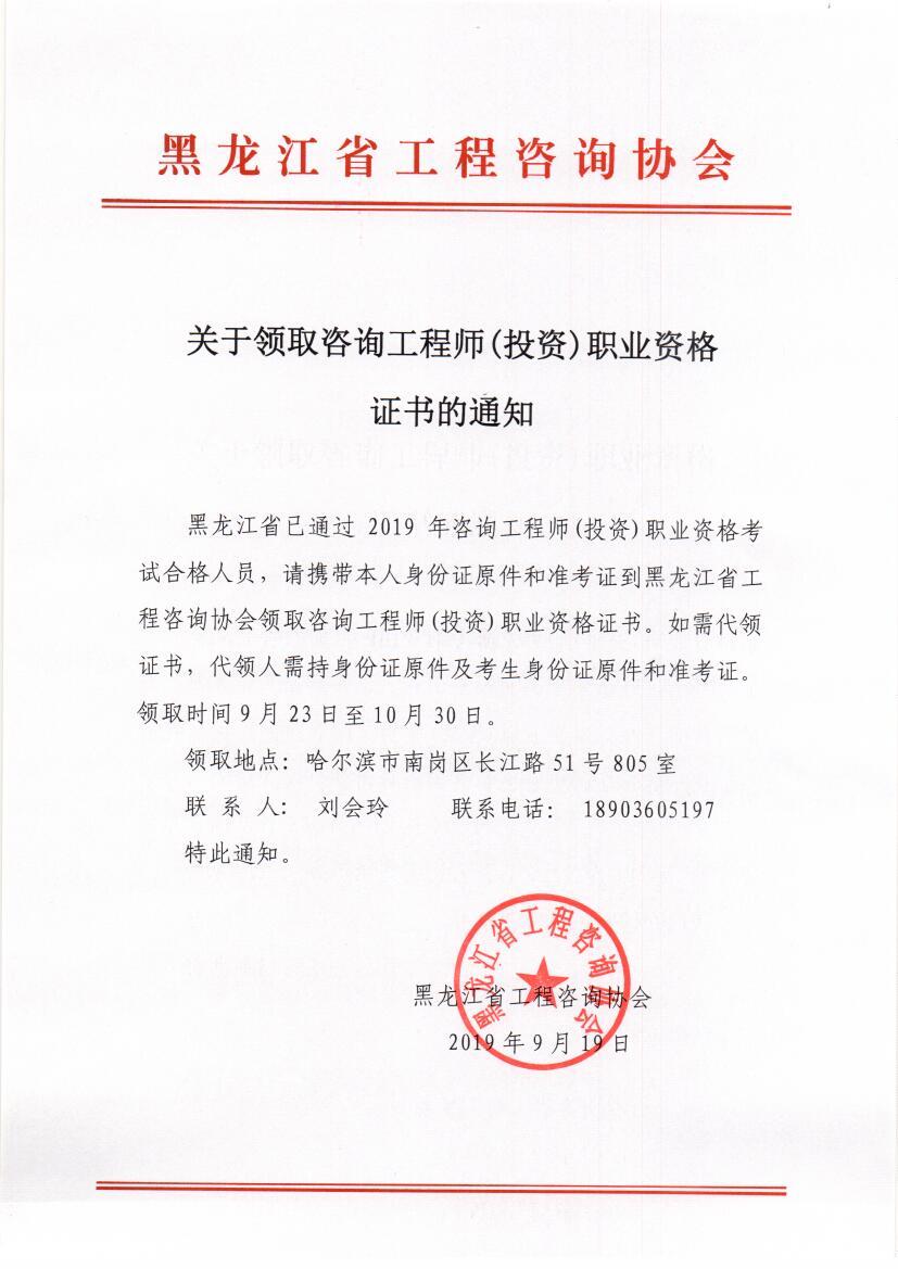 黑龍江省關(guān)于領(lǐng)取2019年咨詢工程師考試合格證書的通知