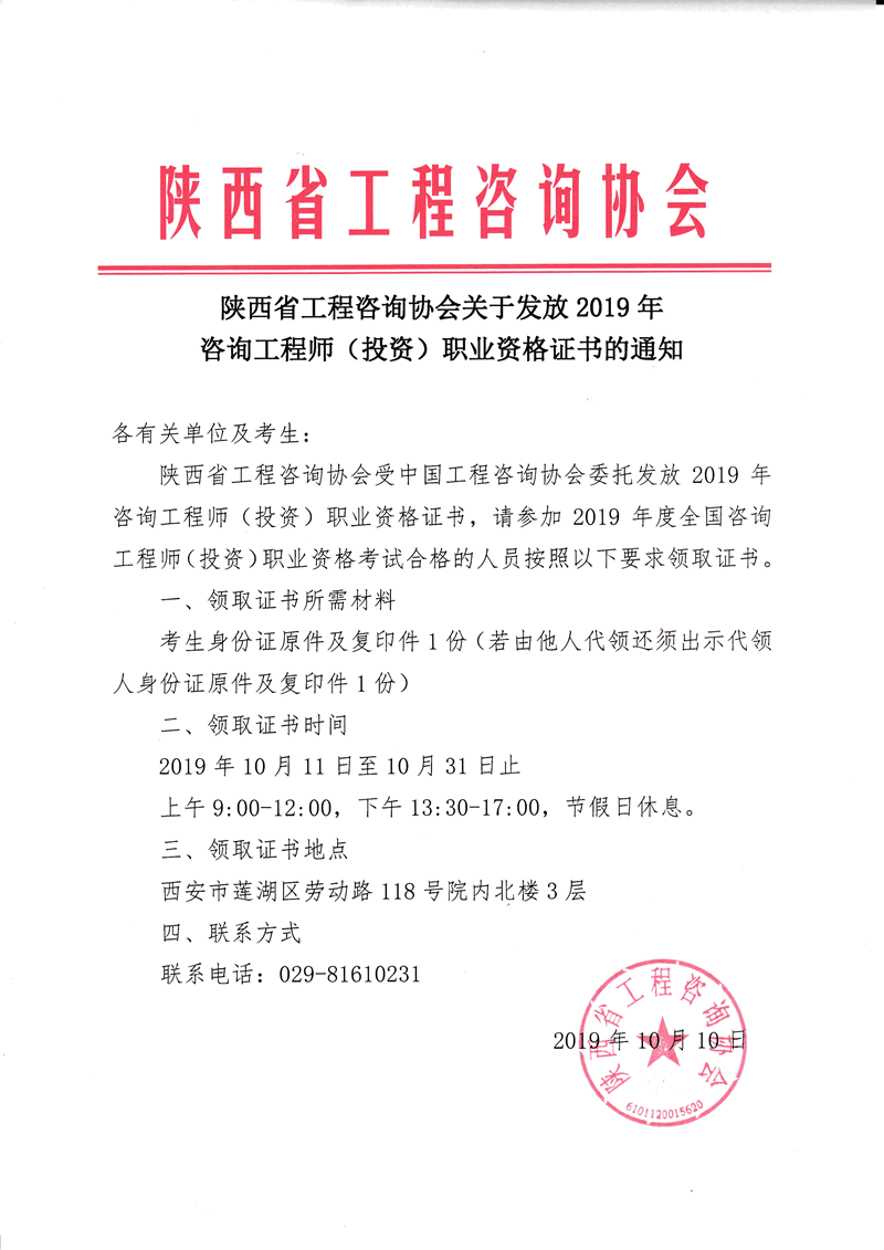 陜西省工程咨詢(xún)協(xié)會(huì)關(guān)于發(fā)放2019年咨詢(xún)工程師(投資)職業(yè)資格證書(shū)的通知