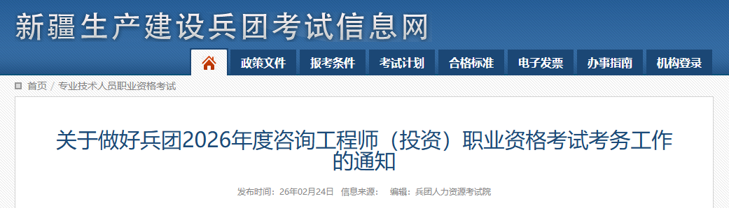 新疆生產(chǎn)建設(shè)兵團(tuán)考試信息網(wǎng)發(fā)布關(guān)于做好兵團(tuán)2026年度咨詢工程師(投資)職業(yè)資格考試考務(wù)工作的通知,具體信息如下: