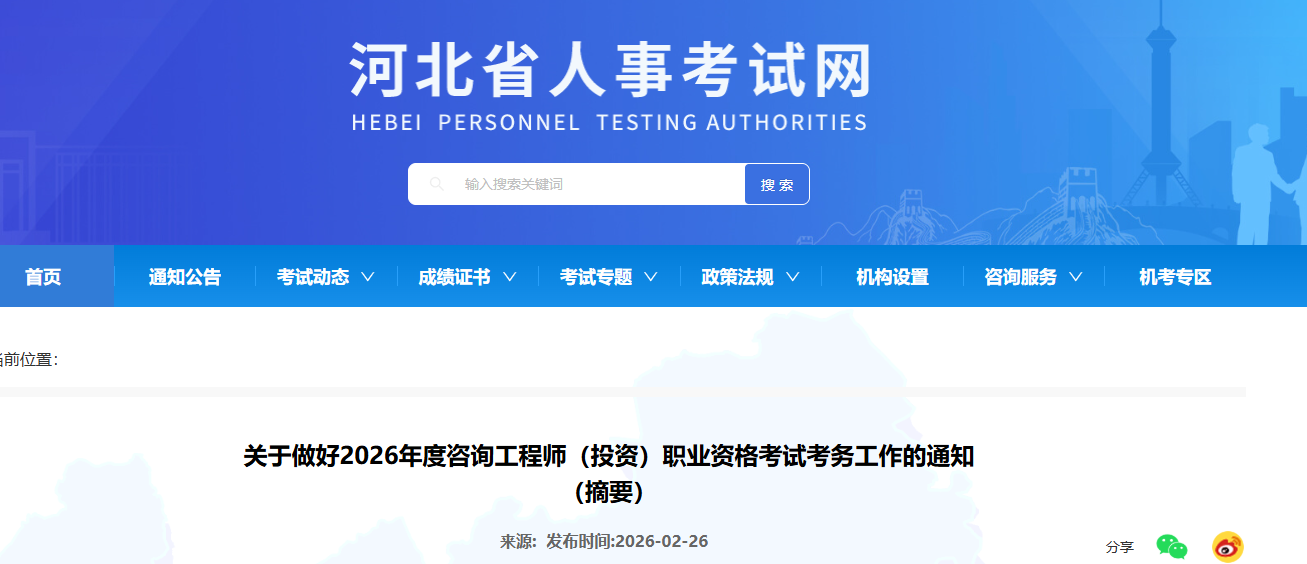 河北發(fā)布關(guān)于做好2026年度咨詢工程師(投資)職業(yè)資格考試考務(wù)工作的通知