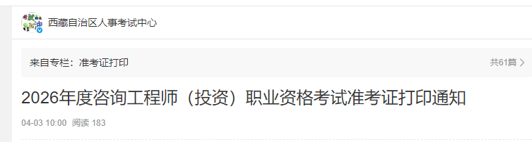 西藏自治區(qū)人事考試中心發(fā)布2026年度咨詢工程師(投資)職業(yè)資格考試準(zhǔn)考證打印通知,具體信息如下: