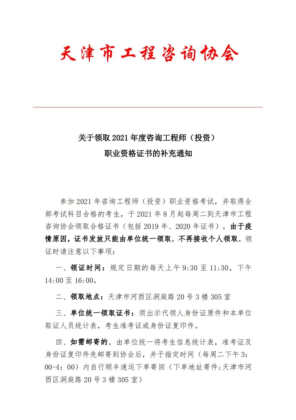 2021年度天津咨詢工程師(投資) 職業(yè)資格證書的補充通知