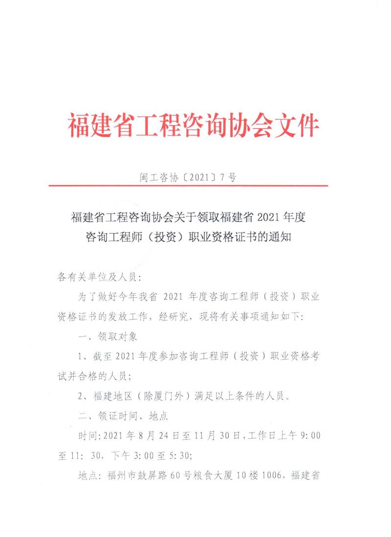 2021年度福建省領取咨詢工程師(投資)職業(yè)資格證書的通知