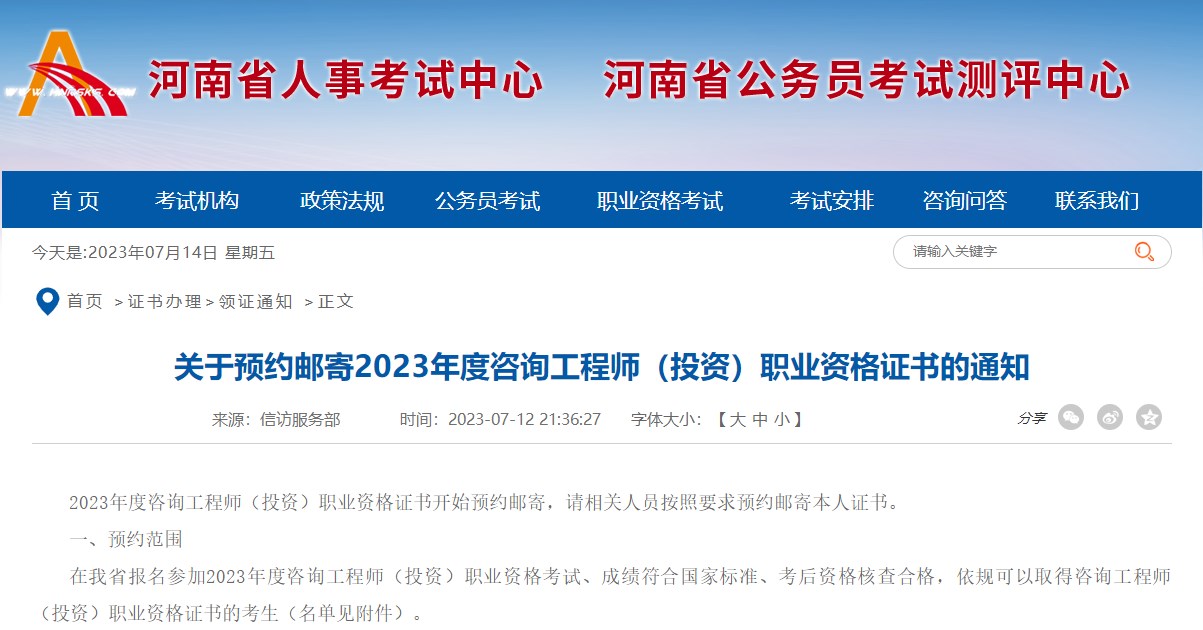 河南關(guān)于預(yù)約郵寄2023年度咨詢工程師職業(yè)資格證書通知